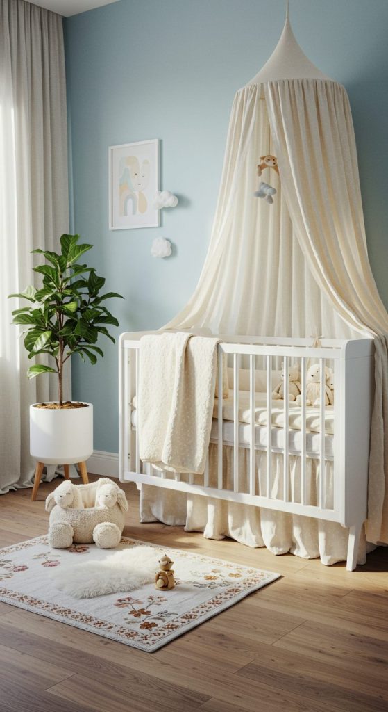 Creating a crib canopy adds an ethereal touch to your nursery. It can make the crib feel cozier and more intimate while allowing for easy removal for cleaning. Choose airy fabrics like sheer cotton or muslin for a light and elegant effect.