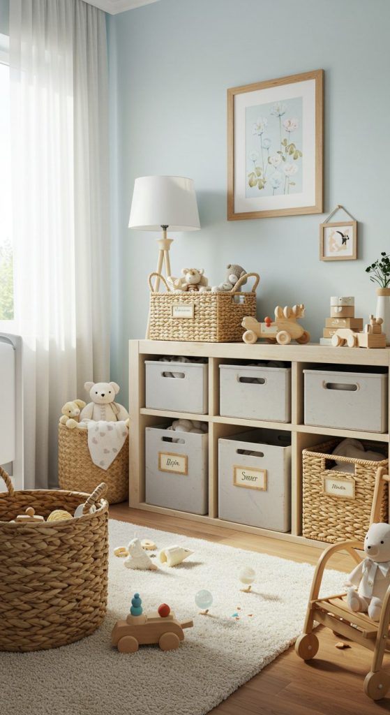 In a nursery, functionality goes hand-in-hand with style. Create storage solutions that are both elegant and practical. Use decorative baskets or vintage crates to store items like toys, clothes, and diapers while providing a cohesive look.