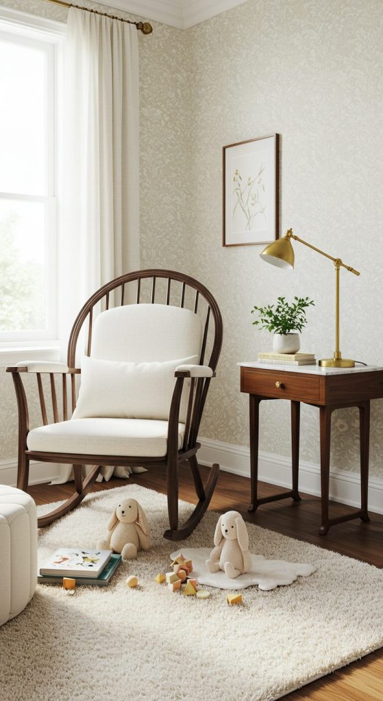 A soft area rug adds warmth and comfort to your nursery while tying together the overall look. Consider a neutral-toned rug or one with soft patterns that complement your color scheme. This not only enhances the elegance but also provides a soft spot for tummy time.