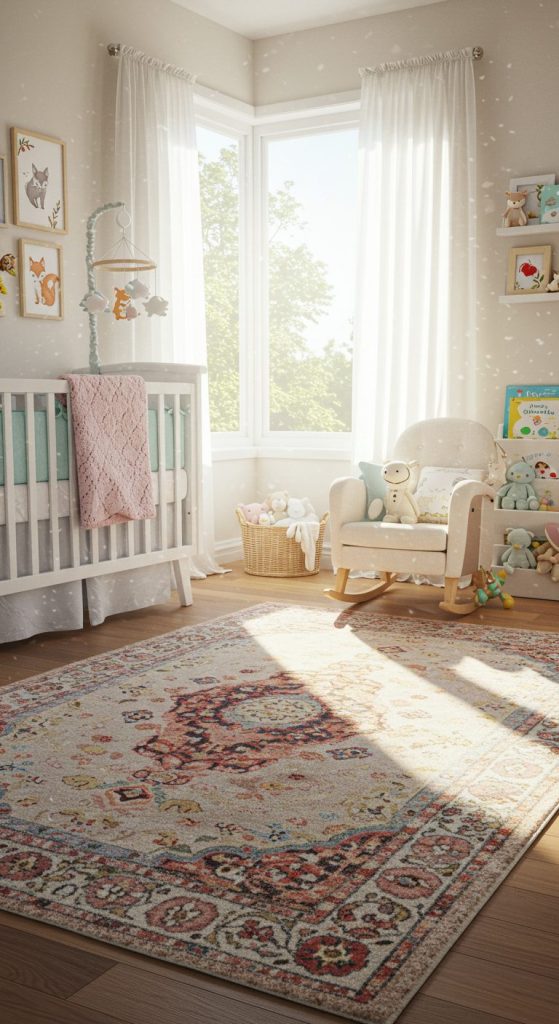 - Placement: Position it in the center of the room or beneath the crib for a cozy feel.