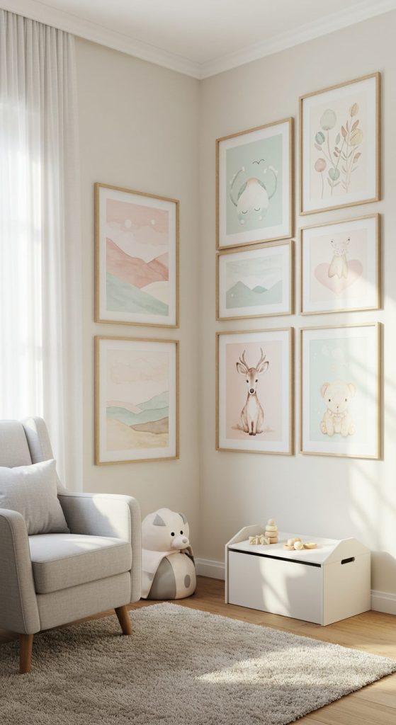 In addition to a gallery wall, consider hanging beautifully framed art prints that reflect themes of growth, love, or dreams. Choose calming colors that will soothe both baby and parents.