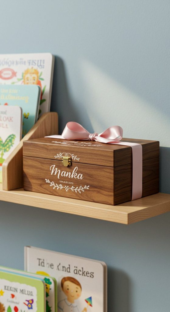 Finally, create a personalized memory box to store keepsakes from your baby’s early years—like first outfits, hospital bracelets, and milestone notes. This box can function as decoration while also being a practical storage solution.