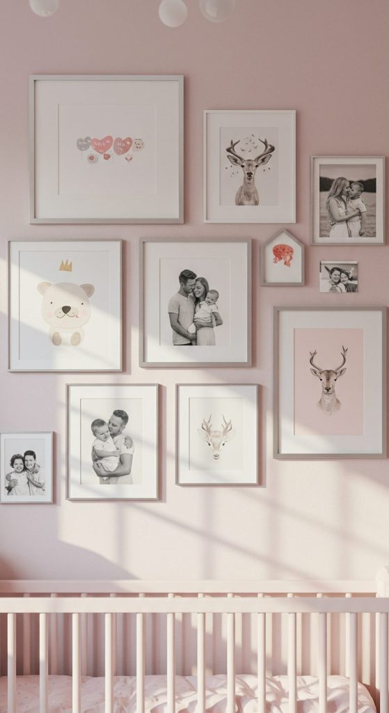 A gallery wall can be an artistic expression that’s also a personal touch in your nursery. Mix family photos with cute art prints and arrange them in elegant frames for a polished look.