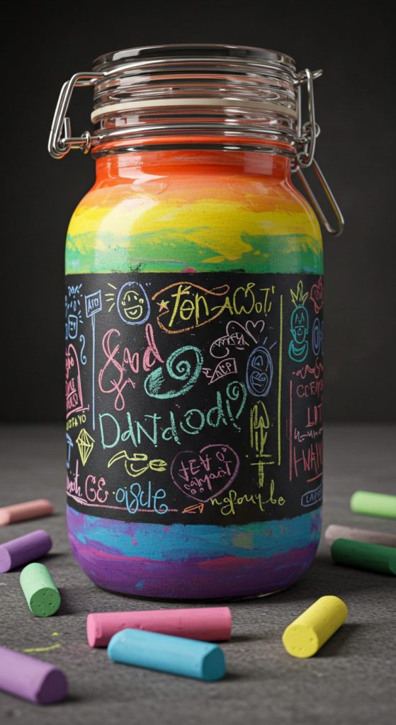 These jars can serve dual purposes: as decorative pieces and as creative outlets for your child. Using chalkboard paint over a rainbow base allows your child to redefine the jar’s look regularly.