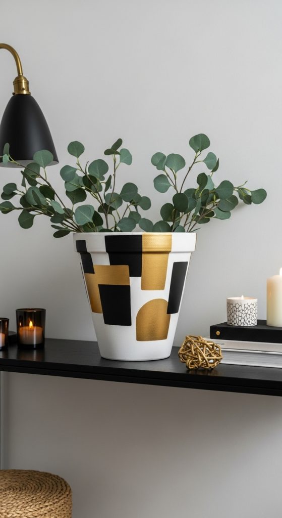 Use bold brush strokes, dots, splatters, and irregular shapes in a mix of vibrant or neutral tones. Go abstract — think of this pot as a mini canvas.