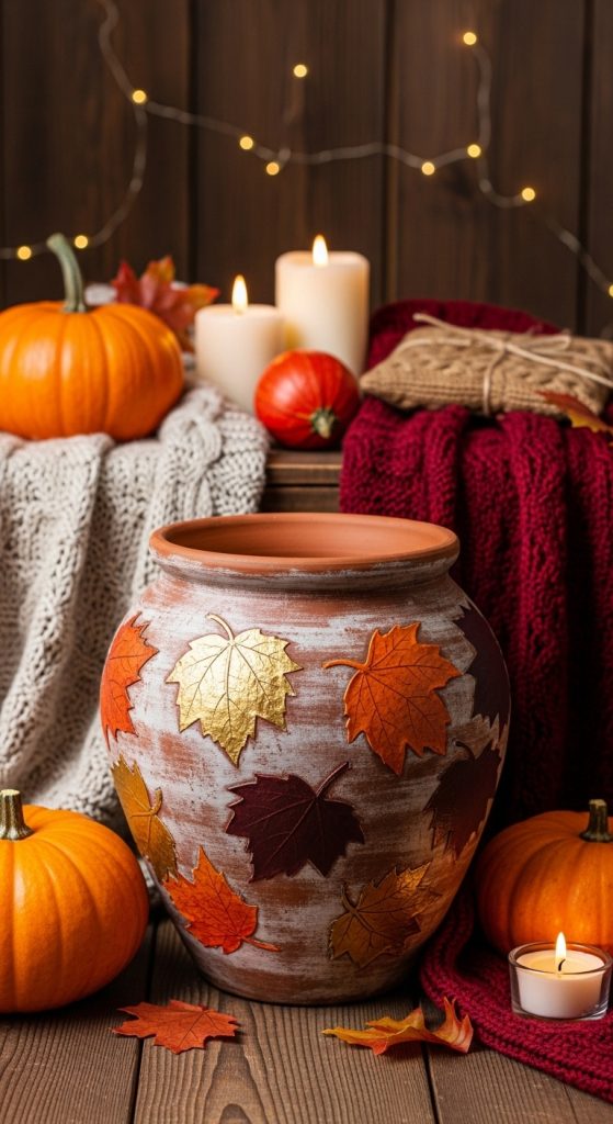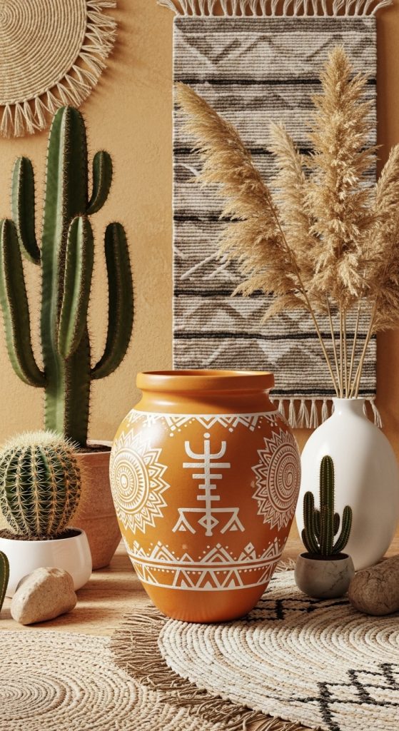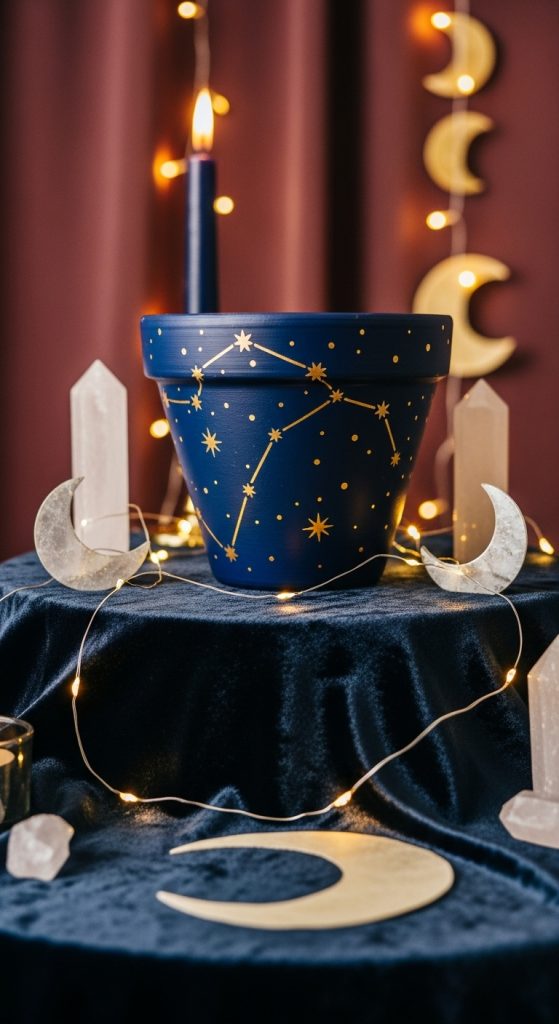 Start with a white or matte background and use fine paint pens or thin brushes to create symmetrical mandala patterns. Go for earthy tones like mustard, terracotta, olive green, and rust. This style works well on all pot sizes.