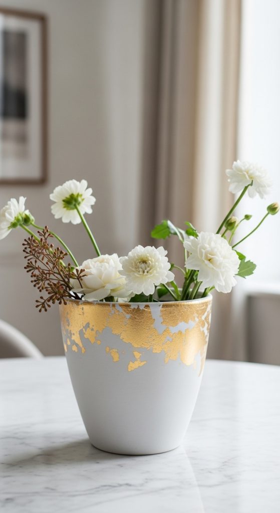 Leave most of the pot in its natural terracotta color and paint white lace-like patterns using stencils or freehand techniques. The contrast is soft, romantic, and timeless.