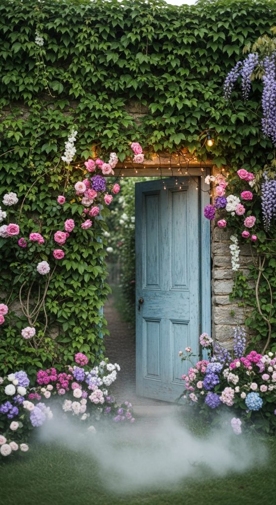 Pro Tip: Frame the door with flowers and add a vintage doorknob for extra charm.
