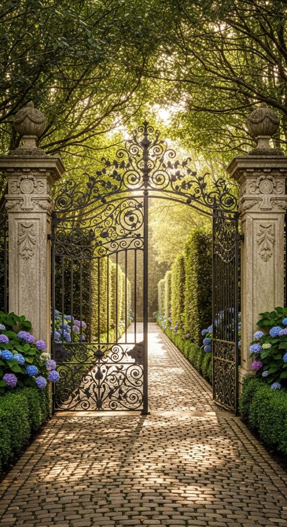 A wrought iron gate brings elegance and sophistication to any garden. Look for gates with intricate scrollwork or floral motifs for a touch of artistry. Pair this with a stone pathway for a European-inspired garden entrance.