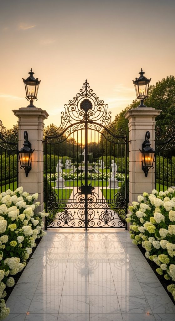 For a grand and formal entrance, combine stone or brick pillars with an iron gate. This design offers security without sacrificing style. Add lanterns or planters on top of the pillars for an elegant touch.