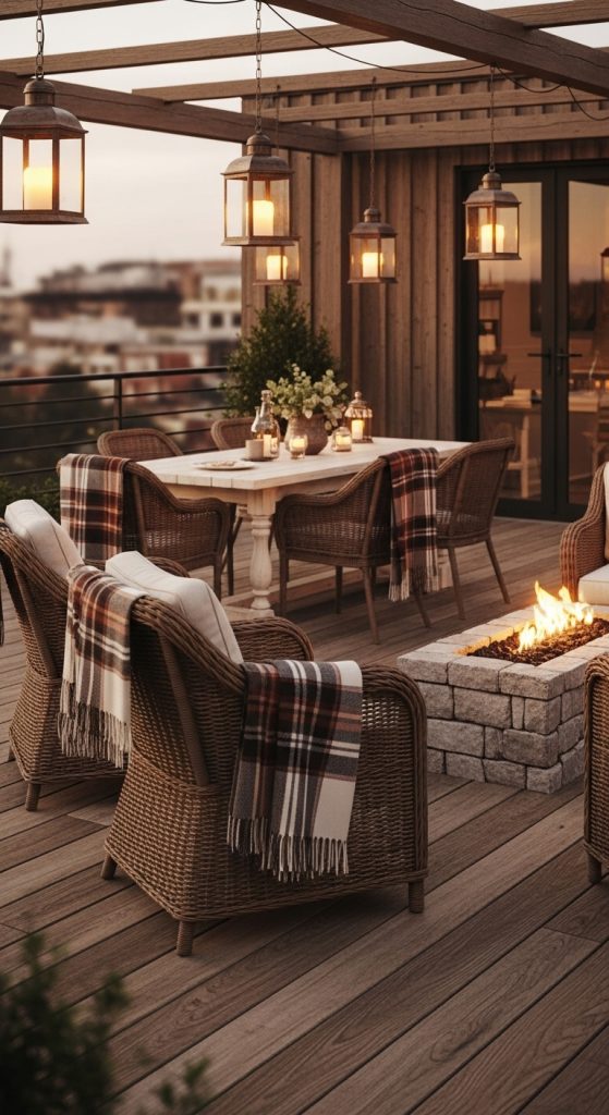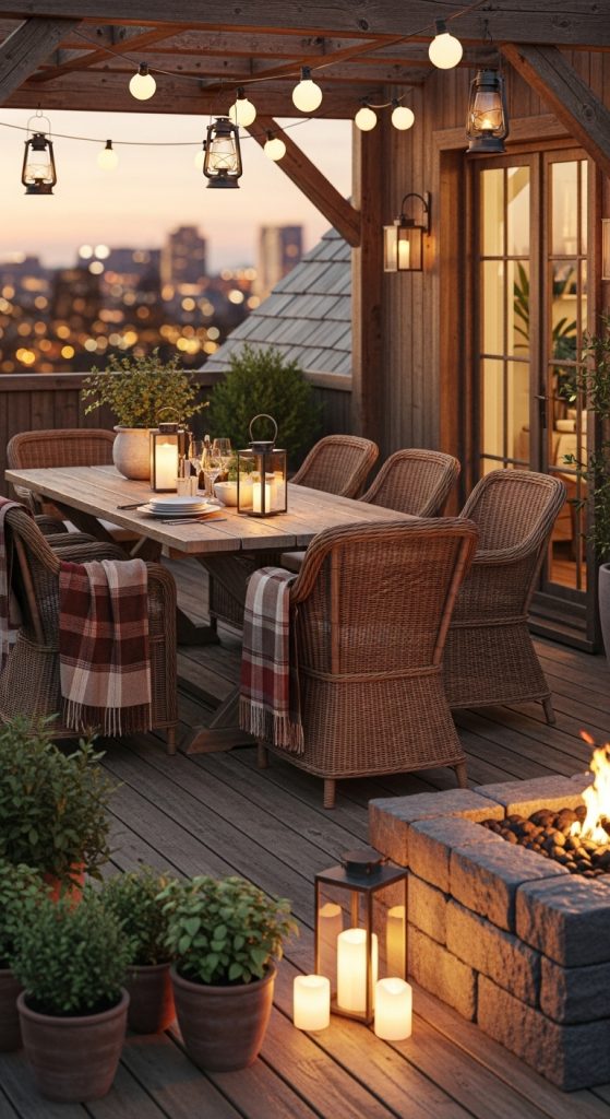 ✨ Why it works: A Scandinavian rooftop feels calming, warm, and intimate—great for chilly evenings with candles and friends.