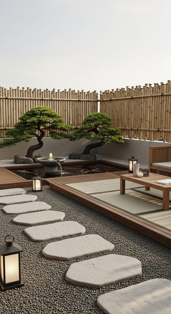 - Key Elements: Bamboo fencing, water features, tatami mats, bonsai trees, and minimalist furniture.