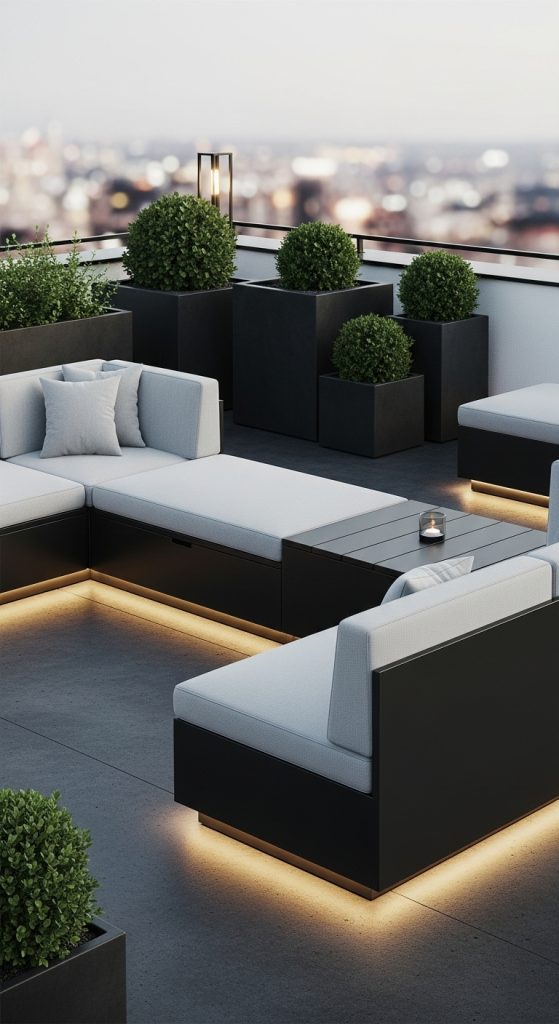 - Key Elements: Concrete planters, low-profile furniture, modular sofas, and hidden storage benches.