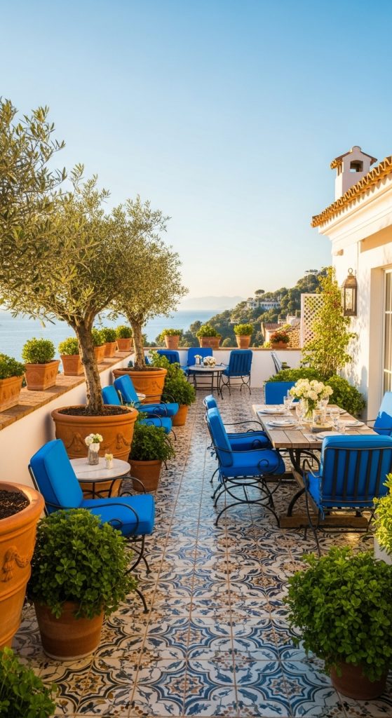 - Key Elements: Whitewashed walls, terracotta pots, tiled floors, and wrought-iron furniture.