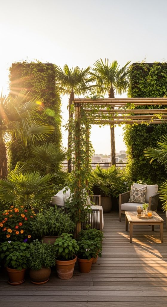 ✨ Why it works: An urban jungle rooftop not only looks beautiful but also reduces heat, purifies the air, and makes the space feel like an escape from city life.