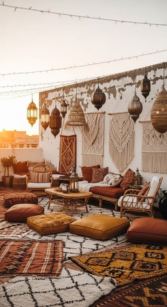- Key Elements: Layered Moroccan rugs, poufs, oversized pillows, rattan furniture, hanging lanterns.