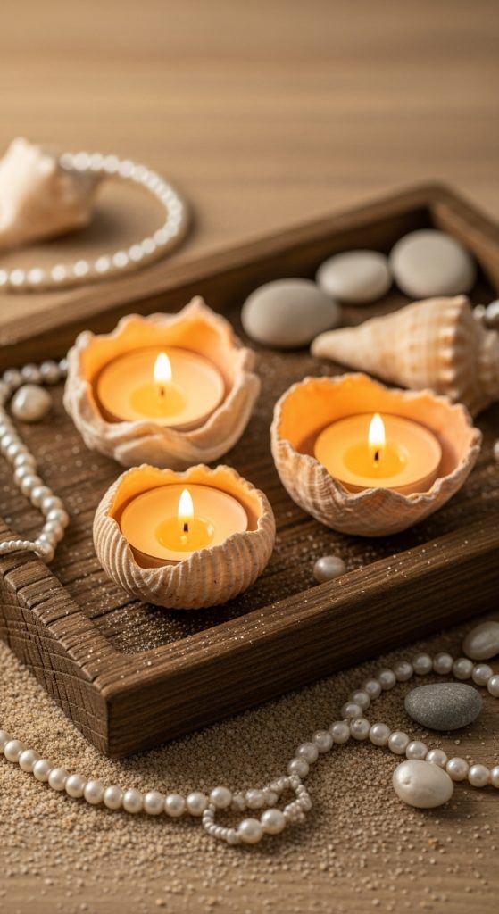 Add a romantic, coastal glow to your home with seashell candle holders.
