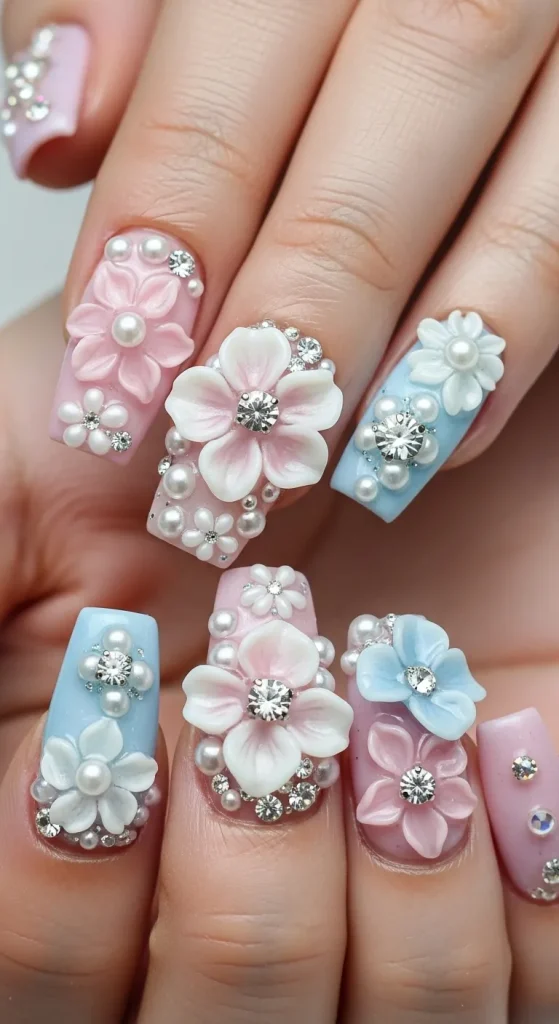 These nails feature sculpted flowers made with acrylic or gel that sit gently on top of the nail surface. The flowers are usually paired with soft pastel backgrounds and tiny pearl or crystal centers.