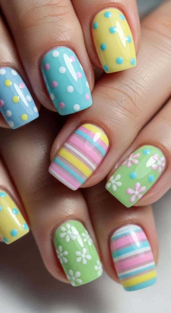 Each nail can feature a different egg-inspired pattern such as tiny polka dots, delicate stripes, lace-like details, or miniature floral motifs. Using a pastel color palette keeps everything cohesive while allowing the patterns to shine.