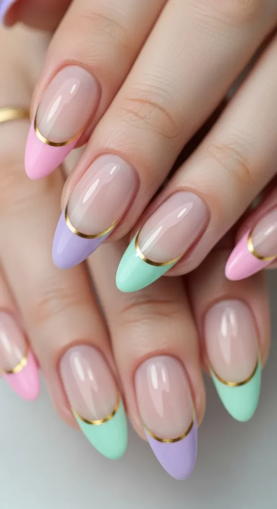 Instead of traditional white tips, use pastel French tips in shades like lavender, mint, peach, and baby pink. Some nails can include tiny floral details or gold lines along the tips to add an extra touch of elegance.