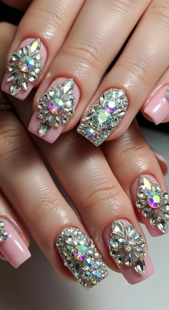 When the light hits the crystals, they create a dazzling effect that instantly makes the manicure look glamorous. Despite the sparkle, keeping the color palette soft ensures the nails remain classy rather than overpowering.