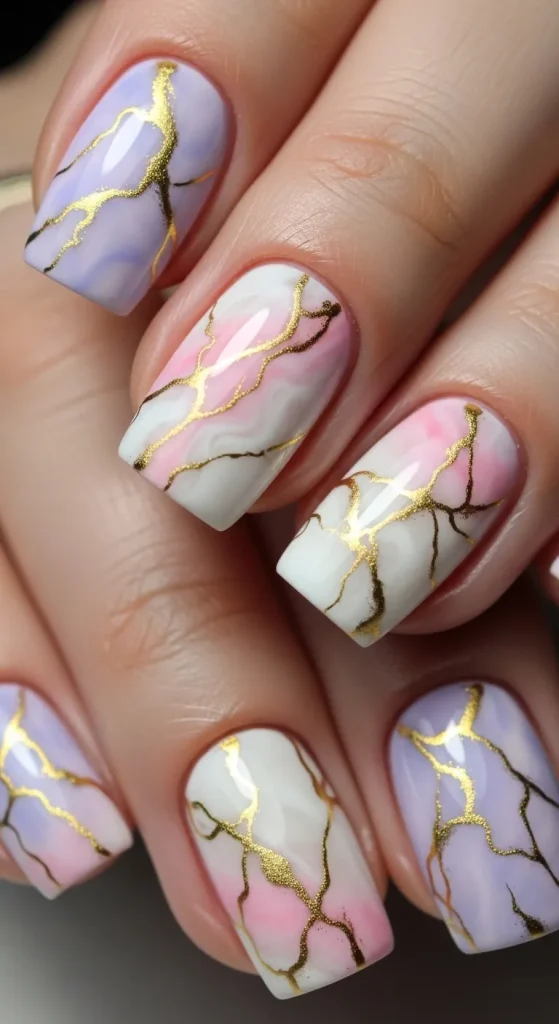 Soft marble swirls in pastel pink, lavender, and cream can be blended together to create an elegant stone-like pattern. Thin gold lines or foil details running through the marble pattern make the nails look even more luxurious.