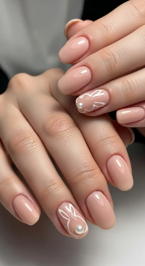 Instead of cartoon-style bunnies, choose a simple line-art bunny silhouette on a neutral base. The rest of the nails can remain plain pastel or soft nude tones to keep the look clean and sophisticated.