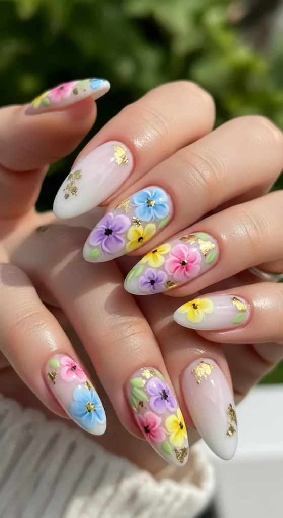Tiny gold leaves or micro crystals placed in the center of each flower create a stunning detail that makes the nails look like miniature pieces of art. The result is a dreamy garden-inspired manicure that feels both romantic and elegant.