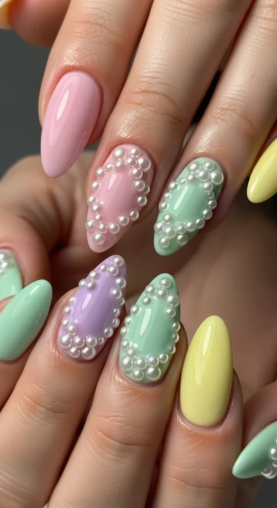 Soft pastel nails are one of the most iconic Easter looks, but adding pearl accents transforms them into a luxurious statement.