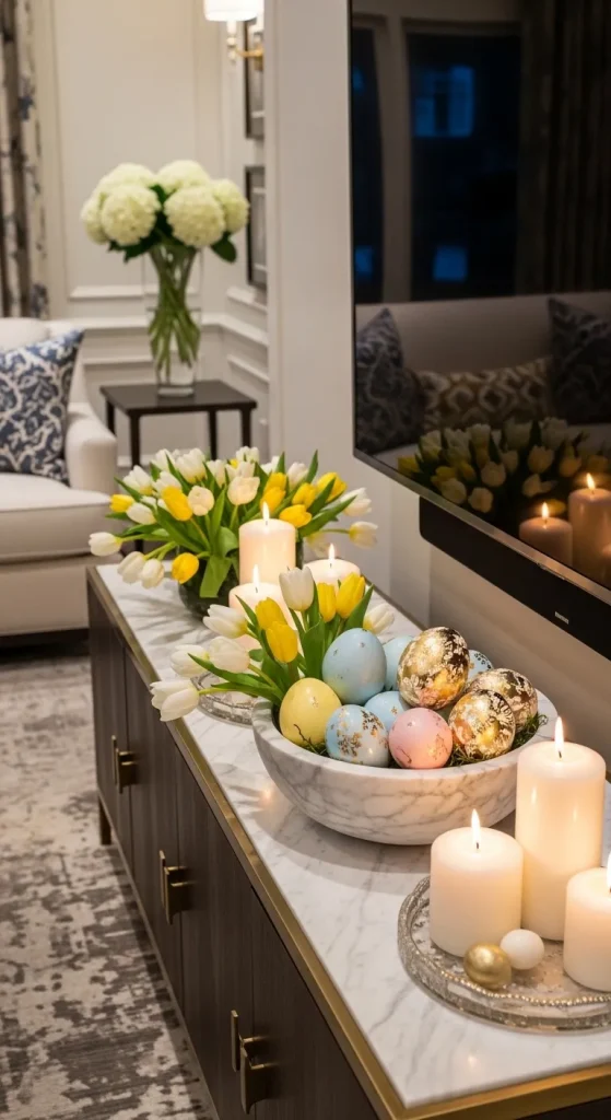 The mix of textures and materials creates a high-end Easter decor statement that instantly elevates your living room.