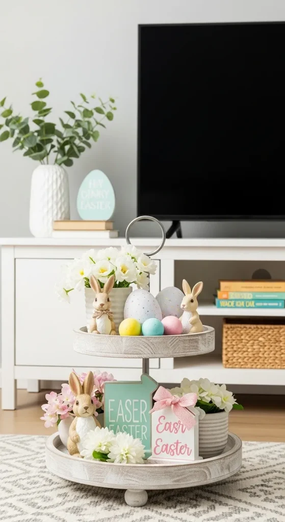 A tiered tray is perfect for displaying many small Easter decorations while keeping everything organized.