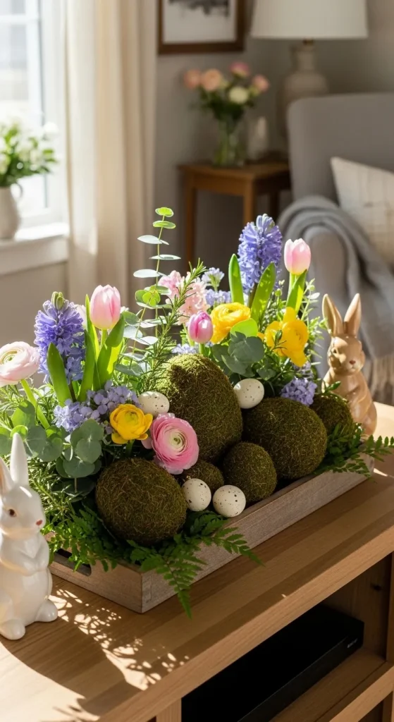 Turn your TV stand into a mini spring garden. Use fresh or faux greenery, moss, and blooming flowers to create a natural Easter vibe.