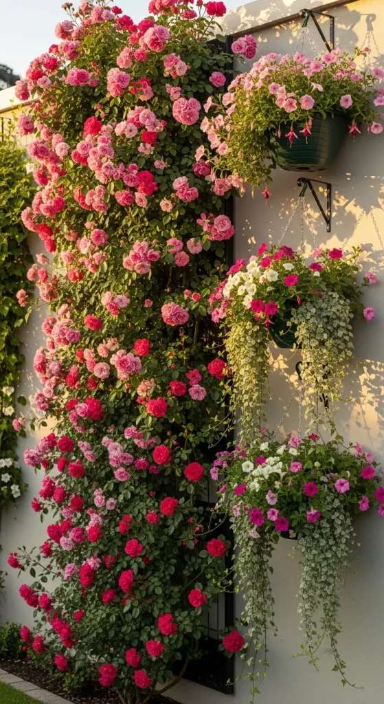 Climbing roses, ivy, and flowering vines create a lush wall of greenery and blooms. Hanging baskets can also add layers of flowers at different heights.