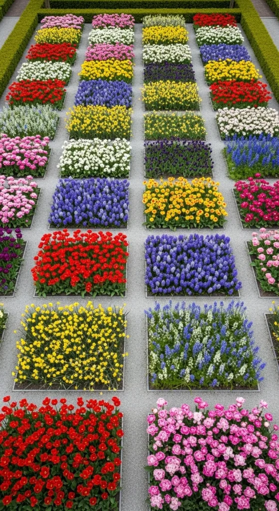 Each square can contain a different flower variety, creating a patchwork of colors and textures. When viewed from above, the garden resembles a beautiful mosaic of blooming flowers.