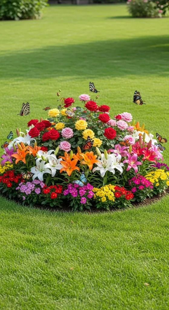 A circular flower garden layout creates a strong visual focal point in the yard. This design is ideal for placing in the center of a lawn or courtyard. Flowers are arranged in circular layers, often with the tallest plants in the center and shorter blooms around the edges.