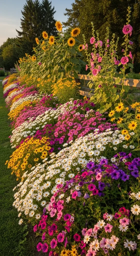 This layout not only saves space but also turns plain walls or fences into breathtaking living art.