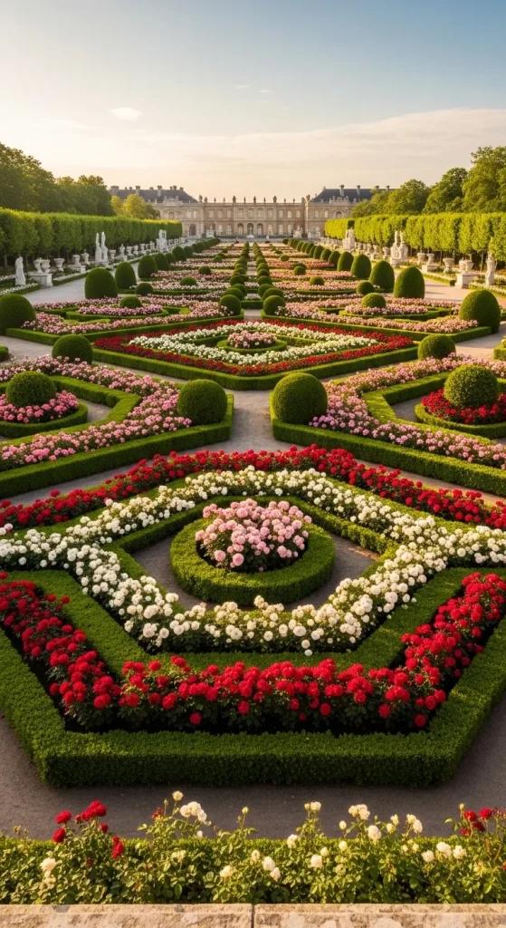 Flowers are planted in neat geometric shapes such as squares, rectangles, or diamonds. Hedges or borders often outline the planting beds to create crisp lines.