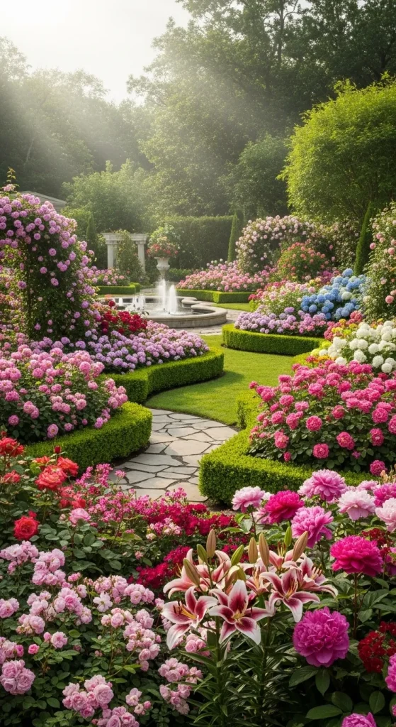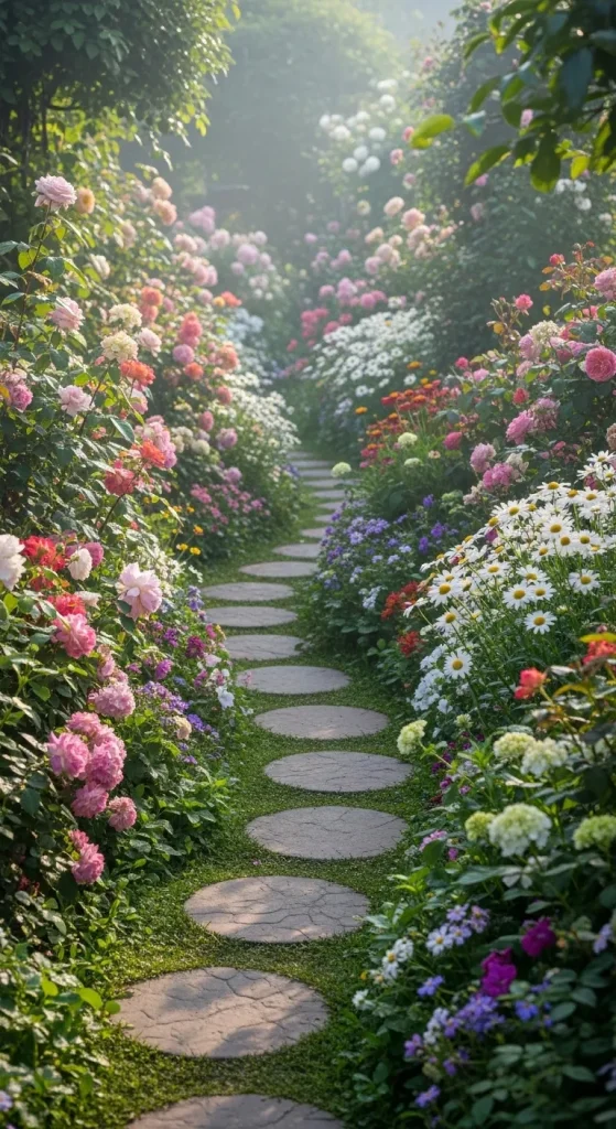 Paths made of stone or gravel often weave gently through the garden, allowing visitors to walk among the blooms. This layout is perfect for gardeners who want a colorful and relaxed garden that feels vibrant and full of life.