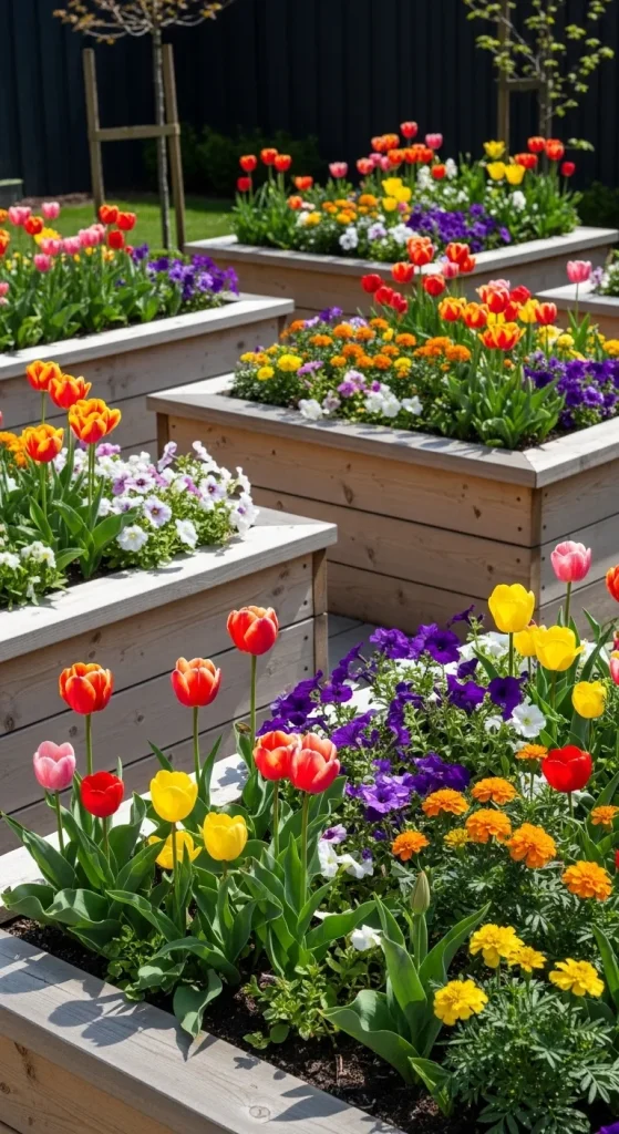 Each raised bed can feature a different type of flower or color theme. For example, one bed may contain pastel flowers while another features bright summer blooms. This creates a visually appealing pattern across the garden.