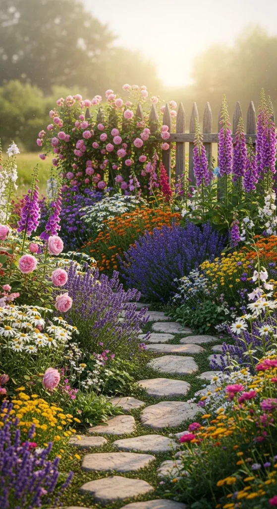 Flowers like lavender, daisies, foxgloves, roses, and delphiniums are often planted closely together. The goal is to create a dreamy floral scene that looks like it belongs in a countryside fairytale.