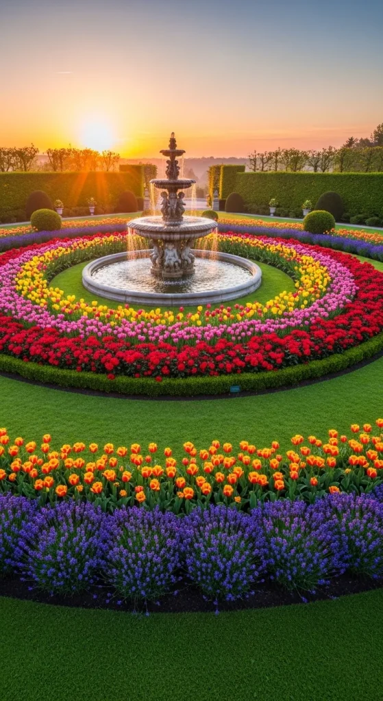 The symmetry of this layout makes it extremely pleasing to the eye. Gardeners often place a decorative element like a birdbath, fountain, or sculpture in the center to enhance the design. Surrounding the center with vibrant seasonal flowers such as roses, tulips, and petunias creates a mesmerizing color gradient.