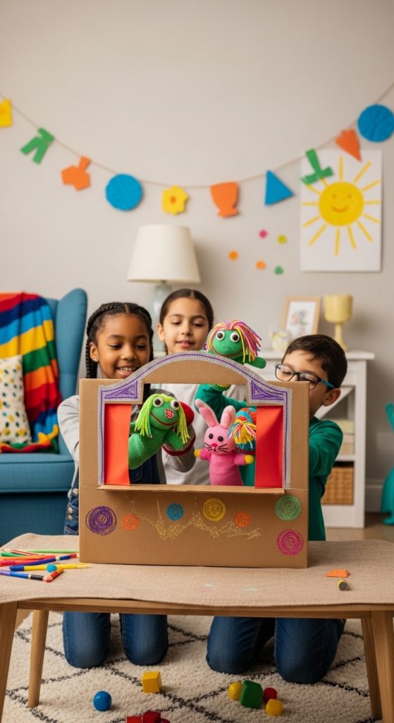 You can create simple puppets using socks, paper bags, or cardboard cutouts. Then let kids create their own characters and stories. They can perform a puppet show for the whole family.