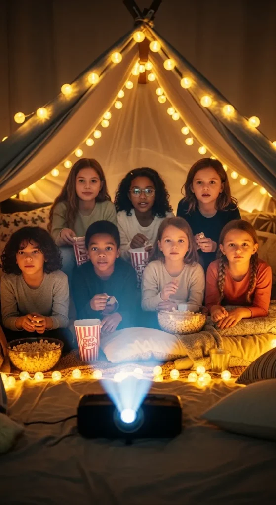 Watching a movie together in a cozy setup makes the experience feel special and exciting for children.