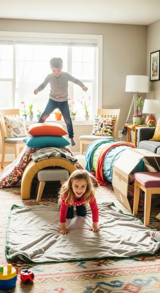 Use pillows, chairs, boxes, and tape to create fun challenges. Kids can crawl under tables, jump over pillows, balance on a line of tape, or hop through hoops.