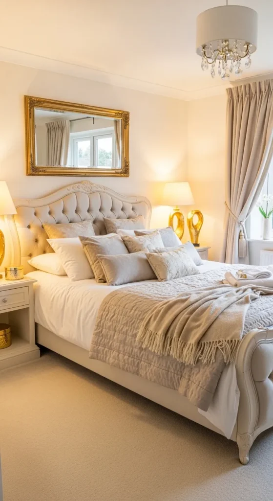 A cream tufted bed with plush bedding, golden bedside lamps, and elegant decor pieces can transform the space into a luxurious retreat.