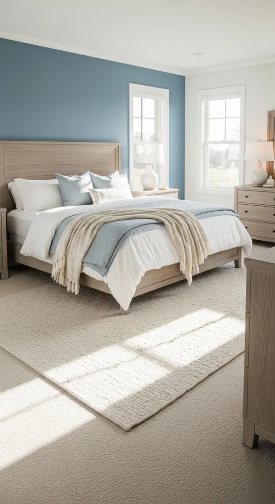 A muted blue accent wall with white bedding and natural wood furniture creates a peaceful coastal-inspired look. Add soft rugs, cozy blankets, and warm lighting to maintain the inviting atmosphere.