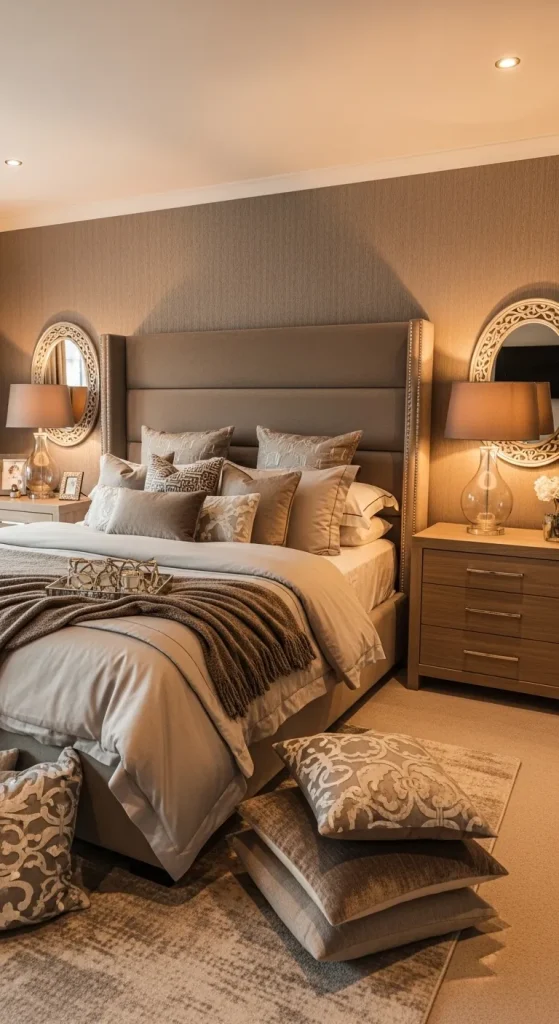 A taupe upholstered bed with layered neutral bedding creates a luxurious and inviting focal point. Pair it with wooden furniture, soft lamps, and decorative pillows in warm tones.