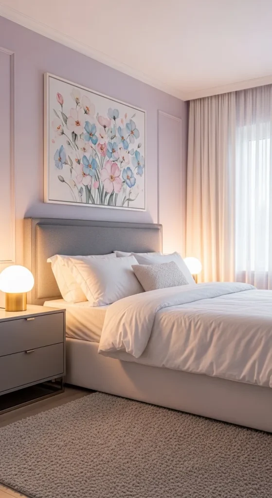 Lavender walls paired with white bedding and light grey furniture create a soft and airy design. Floral artwork, sheer curtains, and plush rugs add elegance to the space.