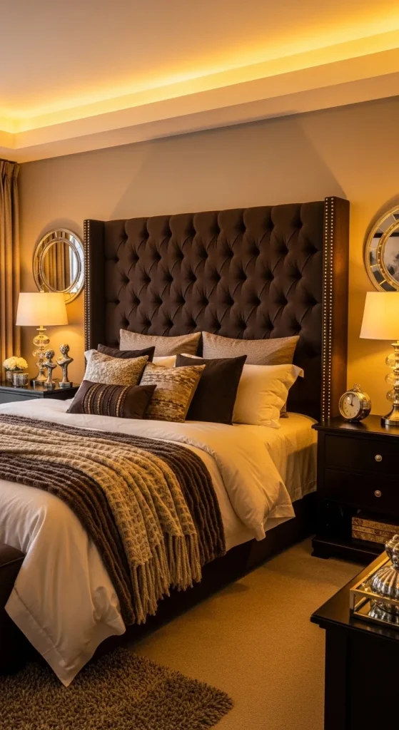 A dark brown upholstered headboard paired with creamy bedding and soft lighting creates a warm contrast. Wooden furniture, warm lamps, and textured throws enhance the comfort level.