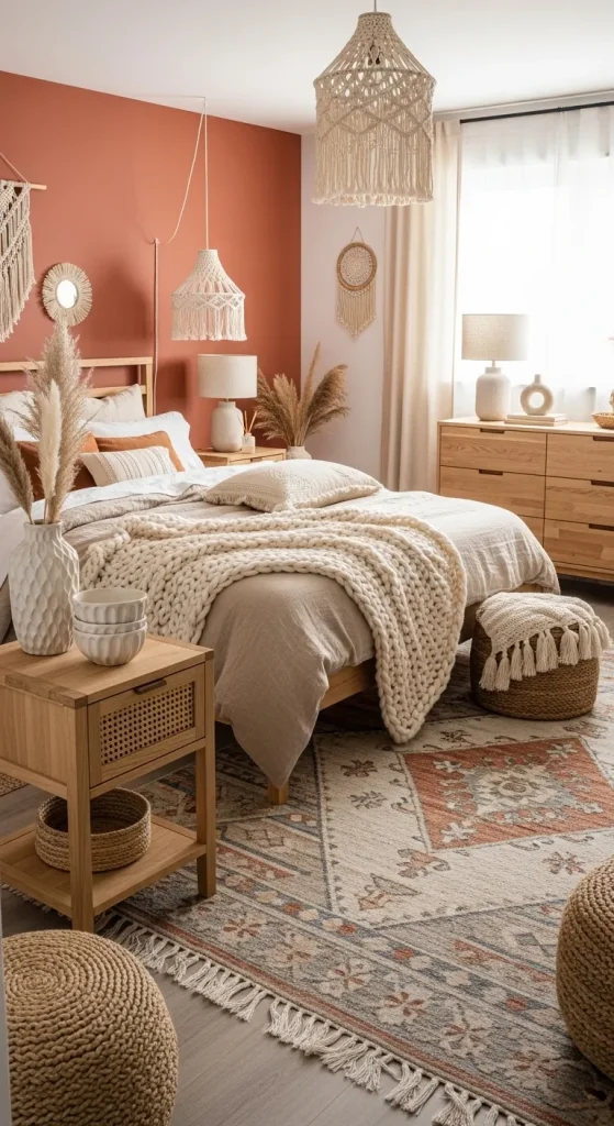 An accent wall in terracotta combined with beige bedding and wooden furniture creates a beautiful earthy palette. Add textured cushions, woven rugs, and ceramic decor pieces to highlight the natural theme.